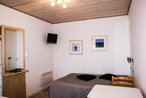 2-personers værelse indeholder ¾-seng, tv med dvd, bord med to stole, lille tekøkken med køleskab og kaffemaskine samt gryder og service.